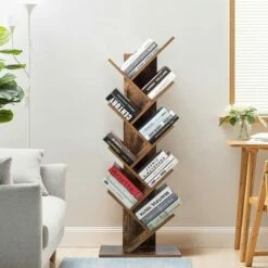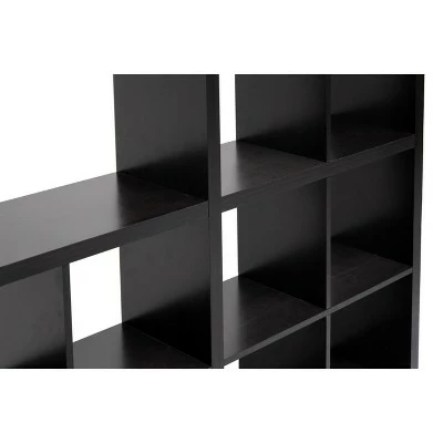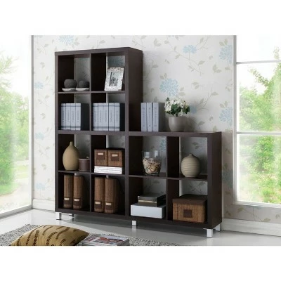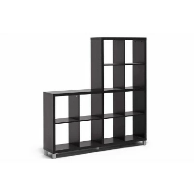 Why hide your book collection or treasures behind doors when you can display them elegantly? The Sunna Designer Shelving Unit is a 12 cube-based modern bookshelf made of faux wood grain paper veneer over a frame of engineered wood. Silver plastic legs with non-marfeet complete this Malaysian-made modern display unit. Assembly is required. To clean, wipe with a dry cloth. Dimensions: 61 inches high x 58.25 inches wide x 11.5 inches deep