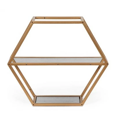 Upgrade the tabletops of your home with an accessory that is sure to garner a second glance from your guests. With an elegant modern glam design that will give a luxurious atmosphere to any room, this decorative shelf will give you the ornamental space you desire, allowing you to de-clutter and reinvigorate your home. Finished with an eye-catching hexagonal shape, beautiful tempered glass shelving, and a dazzling antique gold frame, this piece provides extra display space to any room, allowing you to easily personalize your home.