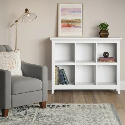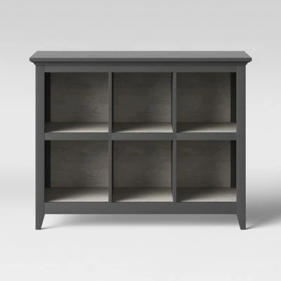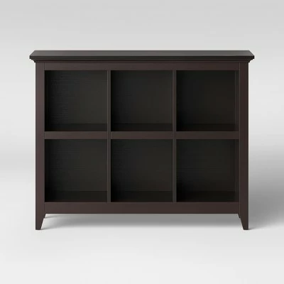 Keep your home tidy with the Carson 6-Bin Organizer Bookcase from Threshold™. This bookcase features six-compartments and it is a great way to organize and display for favorite items. Use this wooden bookshelf to keep your favorite books handy and safe or even use some of the compartments to flaunt a vase with fresh flowers. Keep a comfy chair near this bookshelf so that you will always have a good book just an arm’s reach away.