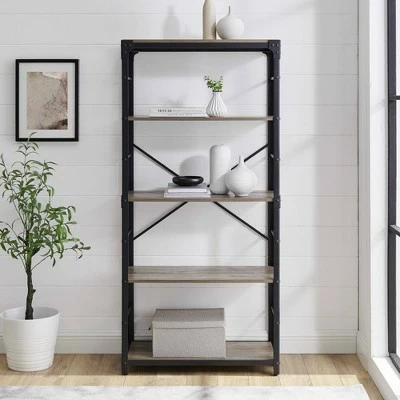 Whether you want to add a masculine element to your bohemian inspired space or capture the spunk of a raw-material look, this metal and wood vertical shelf can deliver on your design dreams while increasing your storage capabilities. With four open shelves, this 64-inch storage unit functions as a bookshelf, media tower, or display shelf. Unit accents include: lateral metal bars, angled brackets at the top, and a thin metal X detail. Plus, this industrial piece comes with wall-fastening for extra stability so if your house is the party place, you and your friends can bust a move worry free.