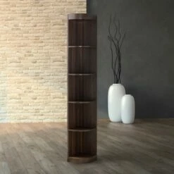 Make use of empty corner space and add functional storage with the contemporary Ronnie Five Shelf Corner Bookcase in dark tone espresso finish. A romantic, sensual shape brings unique character and charm that accents a deep walnut finish creating an artful addition to any room. Flowing sides enrich with stunning visuals and flow as five spacious shelves with rounded edges hold decor, books, and more. Add this elegant bookcase to a bedroom or main living area to provide extra space for display.