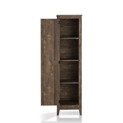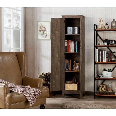 Take farmhouse style decor to the ultimate level with this rustic cabinet. The vertical stand is a prominent furnishing. A barn-style door with a square knob seems to suggest a minimalist lifestyle. However, the oak finished shelf has a bold country stance, that you can’t ignore. Use the piece as a pantry in the kitchen or a bookshelf in the living room.