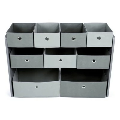 Playtime becomes more fun when your kids can easily take out their toys, books and games and then quickly clean up afterwards. The space-saving Humble Crew Toy Storage Organizer with 9 Storage Bins stows your children’s toys in easy-to-see, easy-to-access collapsible fabric storage bins. Two (2) large, three (3) medium and four (4) small storage containers are easy to remove, replace and reposition along the 3 tiered organizer shelves. Storage bins are sized just right within the toy organizer for toddlers and preschool aged children. Sturdy engineered wood construction frame with steel shelving rods, 20 pound weight capacity per level. Some assembly is required. A great toy storage box alternative; helping keep your little oneβs room clean and organized while at the same time teaching sorting and cognitive skills. Perfect organizational solution for bedrooms, nurseries, nurseries, playrooms and bathrooms.