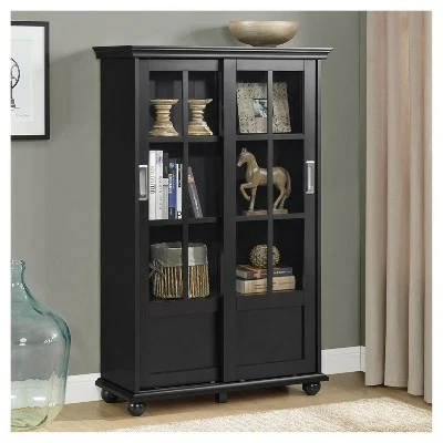 - The sliding glass doors protect the contents from dust