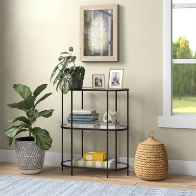 Combine functionality and on-trend design with this eye-catching oval bookcase. Its curved tempered glass shelves are offset by your choice of neutral metallic finishes. The clean lines of its steel frame instantly update any storage space, pairing perfectly with your modern home office or mid-century den.Features : Handcrafted finish is applied to the steel frame.Shelves are made of durable tempered glass.Top and bottom shelves feature a weight capacity of 30 lbs each, the middle shelf can hold 20 lbs.Features easy assembly.Clean with a soft, dry cloth; no harsh chemicals or abrasive cleaning materials.Specifications : Product Dimensions : 14″ x 30″ x 36″Product Weight : 30.86 lbs