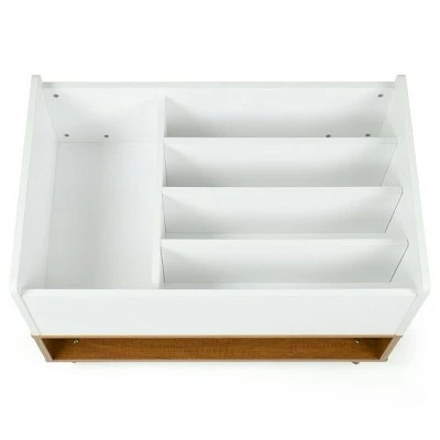 Cut back on clutter and achieve a tidy and organized space with Humble Crew’s stylish Bookshelf Caddy and Toy Storage with Shelf. Four deep upward-facing cubbies in white wonderfully compliment the rich chestnut wood open shelf below to store your books, magazines, and décor. This versatile style is ideal for the bedroom, kids playroom, or living room. At only 17 inches high, this piece is the perfect small-space storage solution and keeps storage in reach for your little ones. Cleaning and maintaining this durable sturdy wood construction is a breeze so your space is always neat and tidy. Fun mid-century legs complete the fresh, Scandinavian look of this piece, making this the perfect organizational piece for any room in your cozy, modern home.