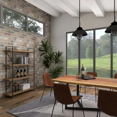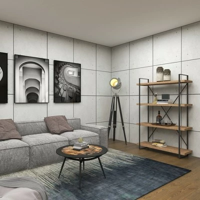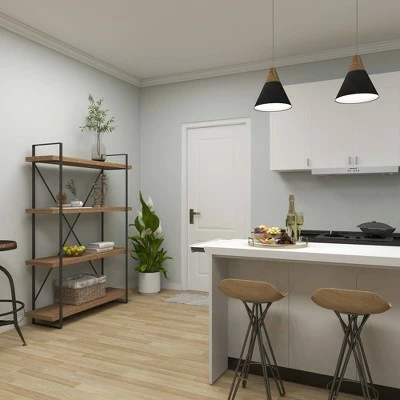- This industrial display shelf highlights a natural wood brown textured finish with obsidian black frame
