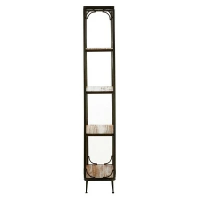 - Features an oversized shelf with 5 rectangular dark brown finished shelving units caged in gray iron frames and an elevated pleated metal base