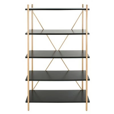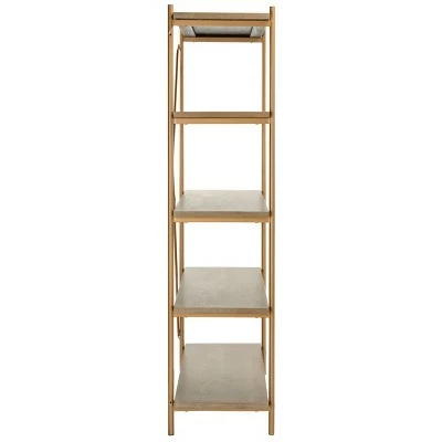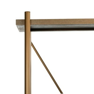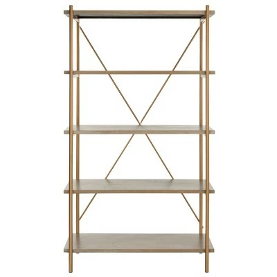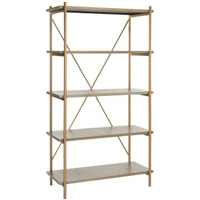 Filled with character and charm, this modern 5-tier étagère was designed to exhibit any curated collection of fine objects. Crafted with a warm rustic oak finish, its gold metal frame adds a luxuriant touch to any living room, dining room or home office. The minimalistic style of Rigby helps adds to your books, pieces, and whatever knick knacks placed on the shelves. A lovely add with sweet country touches to a modern or transitional room.
